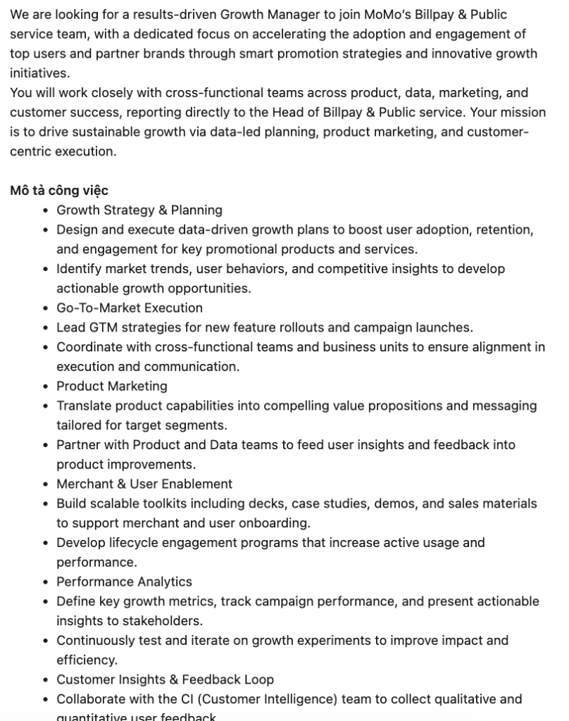 Để thấy điều này trong thực tế, chúng ta có thể tham khảo JD tuyển dụng vị trí Growth Manager tại MoMo dưới đây. Bản mô tả công việc này được tổ chức theo từng nhóm năng lực rõ ràng: Growth Strategy, Go-To-Market Execution, Product Marketing, Performance Analytics và Customer Insights.
