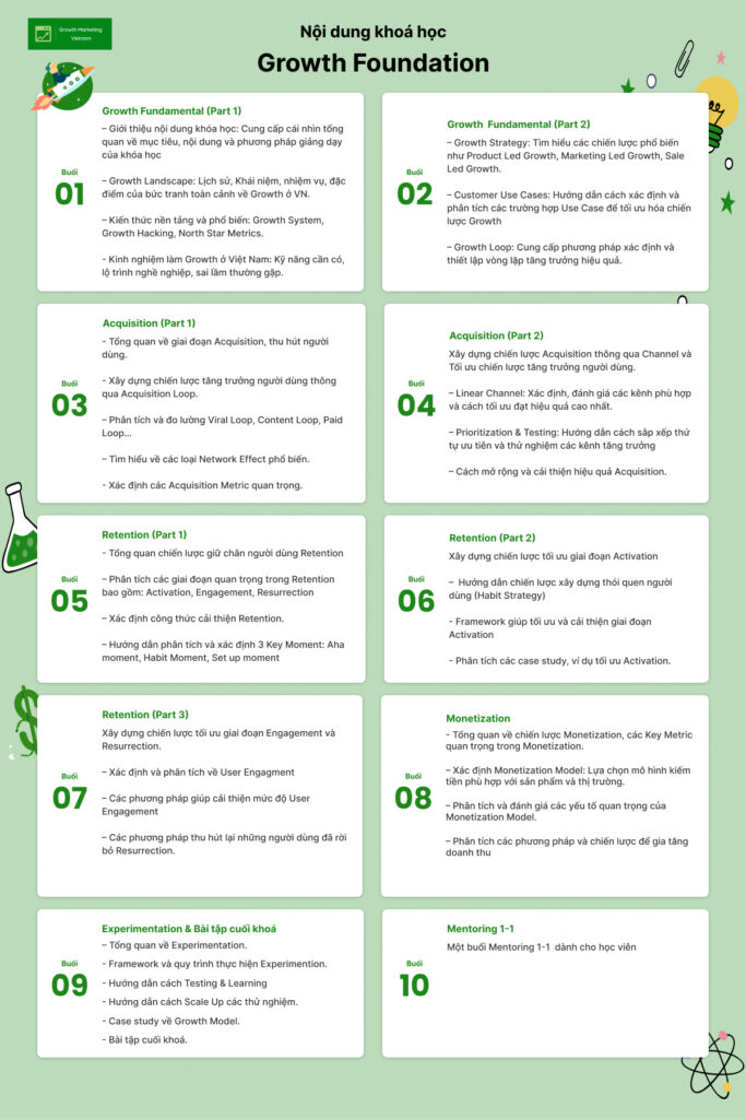 - Hệ thống hóa kiến thức về Growth: Bạn sẽ nắm được bức tranh tổng quan về Growth, từ kiến thức cơ bản đến chuyên sâu hơn, giúp xây dựng nền tảng vững chắc trong lĩnh vực này.