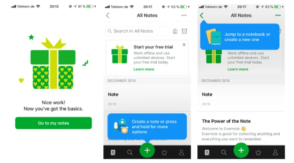Case study: User onboarding của Evernote. “Evernote biến user onboarding thành chuỗi micro-actions: mỗi màn không chỉ nói về tính năng mà gắn với một CTA giúp người dùng thực hiện ngay.